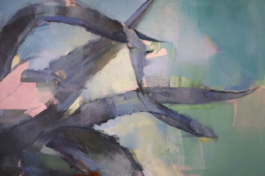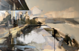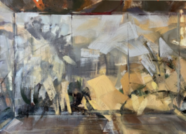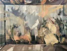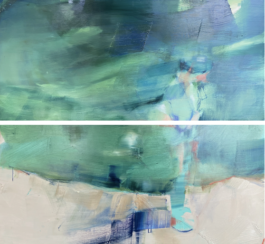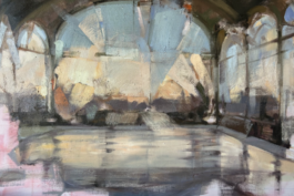 abstract: what she calls the alchemy of being present, or absent, to oneself. Her compositions enclose figures within geometric structures, diagonals, and perspective lines that she treats as the structural backbone of each work, creating a tension between intimacy and distance. Viewers are drawn close by the quality of her brushwork, then held deliberately at arm's length, a dynamic she sees as central to every series she makes.