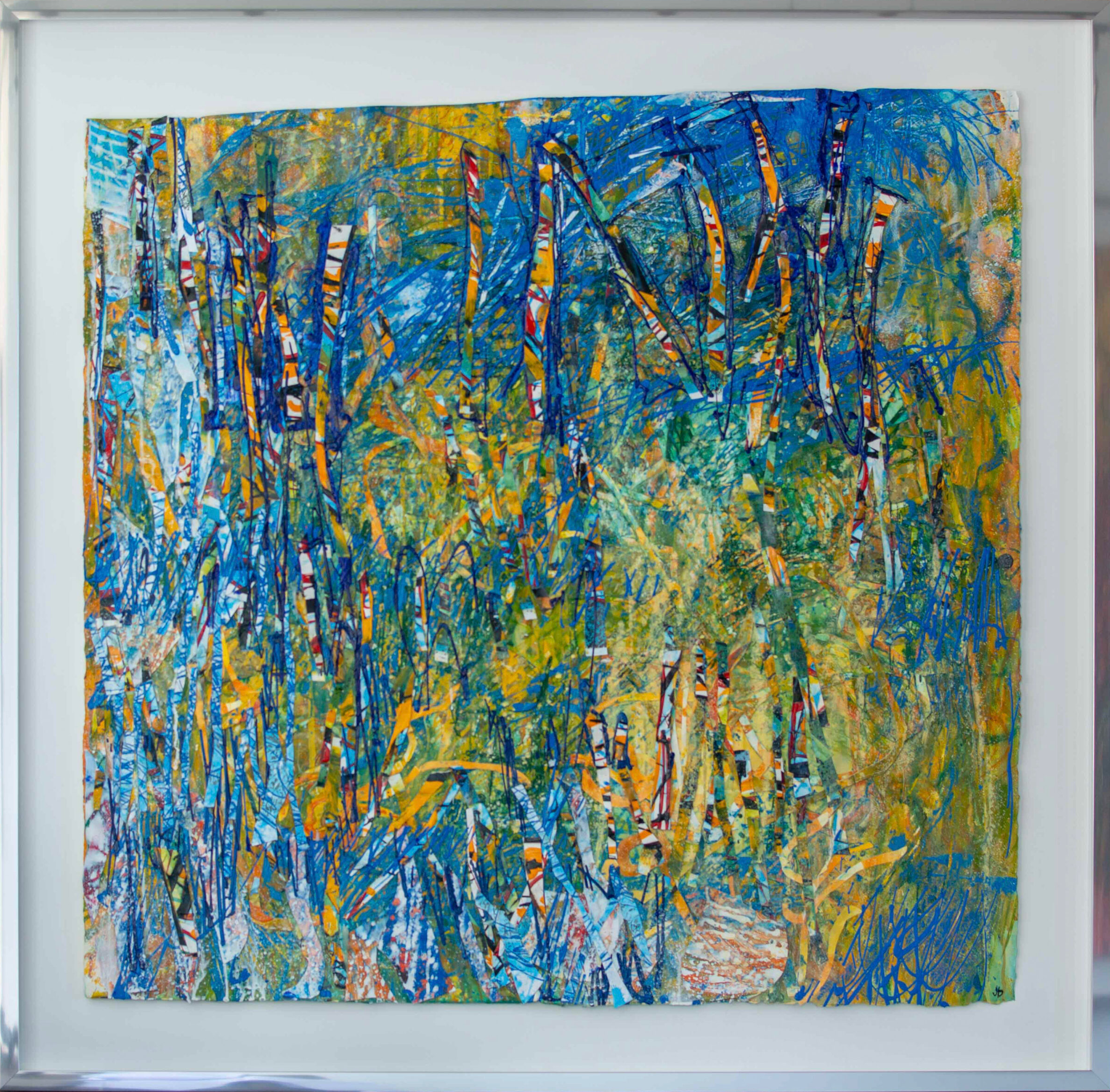 There he embraced the majesty of Aquitaine, a land fought over by kings for centuries. John’s work captures all this. Employing a medley of paper, paint and found objects, his multimedia collages feel abstract at first. Until the viewer notices something. It might be a tell-tale patch of birch trees. Or an ancient chateau peeking through the mist. And then we are transported to the most mesmerising region of France with the elegance of a modern tapestry.